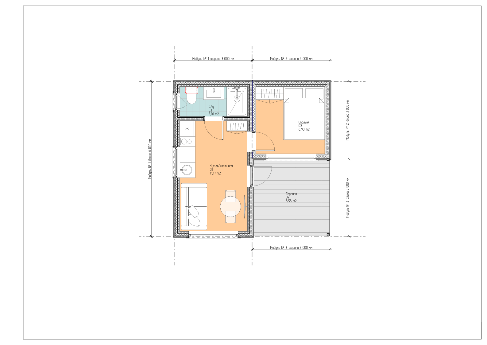 27 м² жилого пространства – это уже полноценная кухня-гостиная, отдельная спальня и санузел. Плюс терраса 9 м² для утреннего кофе или вечернего воздуха. Популярный выбор для постоянного загородного жилья, аренды и глэмпинга